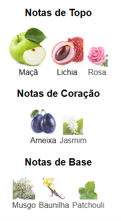 As notas de fundo são: Musgo, Baunilha e Patchouli.