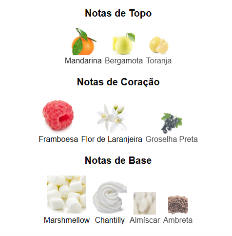 A fragrância abre com uma mistura refrescante de bergamota , tangerina e toranja , despertando os sentidos com uma explosão de energia cítrica. Essa abertura brilhante e revigorante prepara o terreno para um coração de flor de laranjeira , groselha preta e framboesa , oferecendo uma combinação doce e romântica que realça o apelo feminino da fragrância.